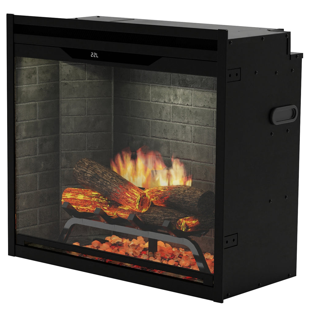 The Dimplex Revillusion Built-in Electric Firebox transforms the classic fireplace with cutting-edge flame technology and refined design. Its patented flame effect, combined with a translucent panel, gives the striking impression of flames rising naturally from the logs. Handcrafted Realogs enhance the experience with a realistic glow, adding authentic warmth and depth. Featuring a full-depth view and adjustable lighting options, Revillusion creates an inviting ambiance for any setting. Available in four stylish backer finishes—Neutral Brick, Weathered Concrete, Herringbone, and Black—it integrates beautifully into both contemporary and traditional décor.