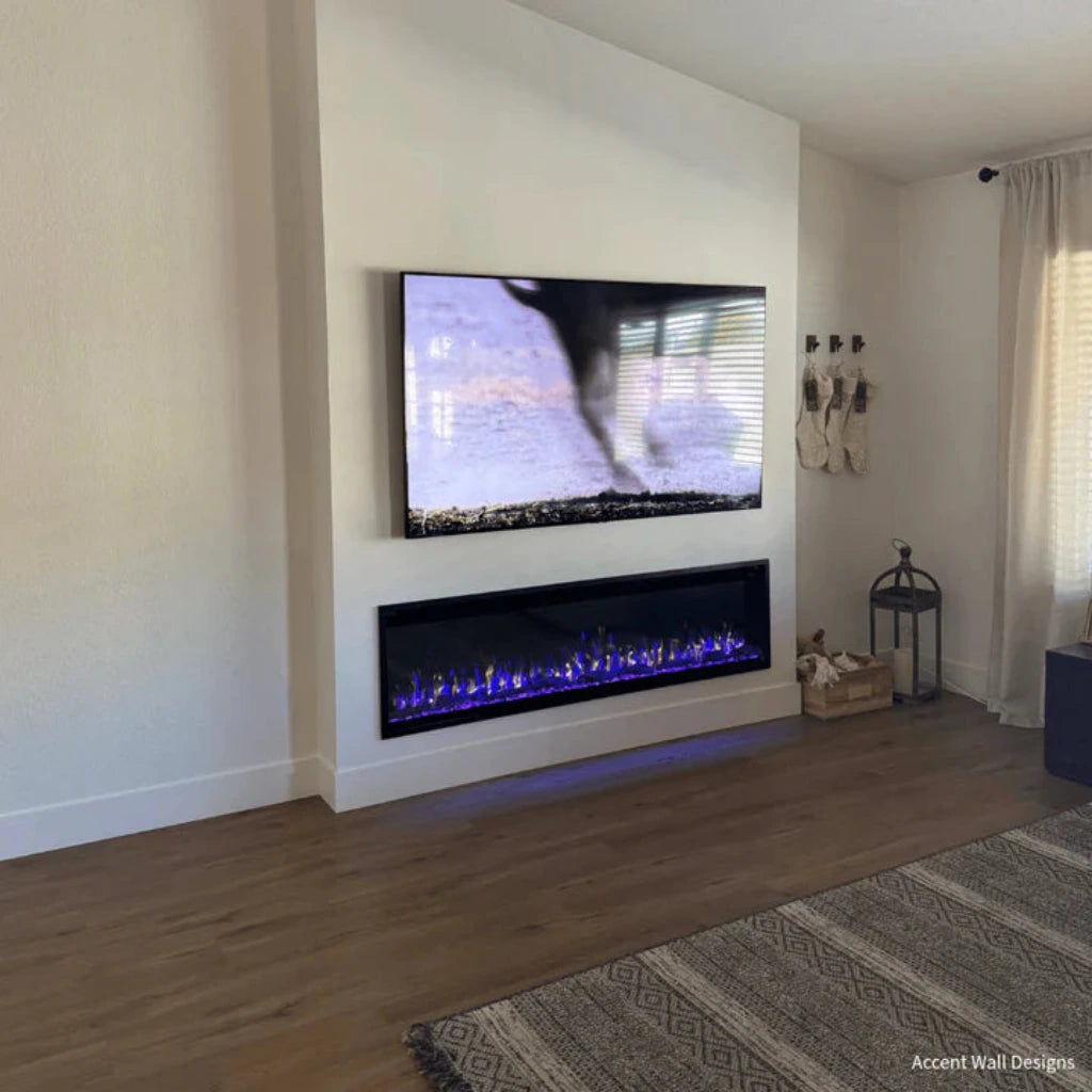 The Touchstone Sideline Elite® Pro 84-inch Smart Electric Fireplace delivers professional-grade flame technology, combining advanced smart-home integration with a stunningly realistic flame display. Designed to elevate any room, it features a deeper viewing area, high-quality crystals and driftwood, and a built-in crackle speaker with adjustable volume for a truly immersive experience. Compatible with Alexa and Google Home, this fireplace offers fully customizable settings, including 6 flame colors, 13 ember bed colors, 5 flame speeds, and 13-color downlighting, allowing up to 78 unique color combinations. Ideal for rooms up to 400 sq. ft., it provides supplemental heat with two adjustable settings and a convenient thermostat mode. An eco-friendly alternative to traditional wood-burning fireplaces, the Sideline Elite Pro ensures a clean, odorless ambiance. Its flexible installation options allow for wall mounting or recessed placement, with easy setup and the ability to safely mount items above the fireplace, recommending an 8-inch clearance. Enjoy the perfect blend of style, comfort, and advanced technology with this luxury smart fireplace.
